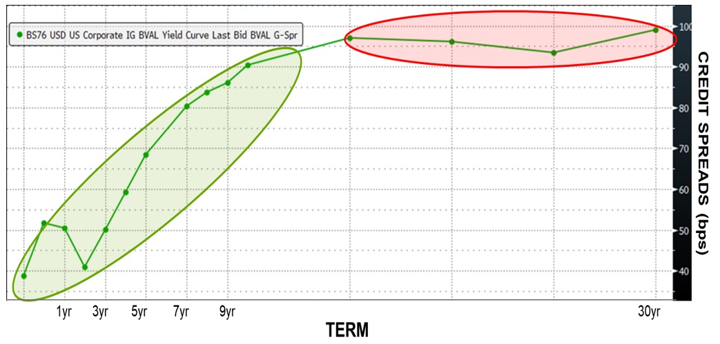 Given the massive outperformance of corporate bonds over Government of Canada bonds, there has been considerable debate about valuations in credit markets. On average, the incremental yield or credit spreads in North American investment-grade corporate bonds are at or near their tightest levels since the GFC. Thus, many pundits argue there is very little value left. That said, as the COTM highlights, there are still parts of the corporate bond market where value can be found. The credit curve, which shows the average credit spread for different terms-to-maturity, is still relatively steep for corporate bonds with shorter terms. This implies that investors are being paid additional yield to invest out to 10 years (green shaded area) and in our view, better opportunities exist. Conversely, the credit curve is very flat as you move toward the longer-end of the curve (red shaded area), implying very little additional reward for investing in the long-end of the corporate market. Thus, we are focusing our corporate bond exposures in the green area and are being very selective in our exposures in the red area. All that to say, opportunities still exist in corporate debt, you just need to know where to find them.
