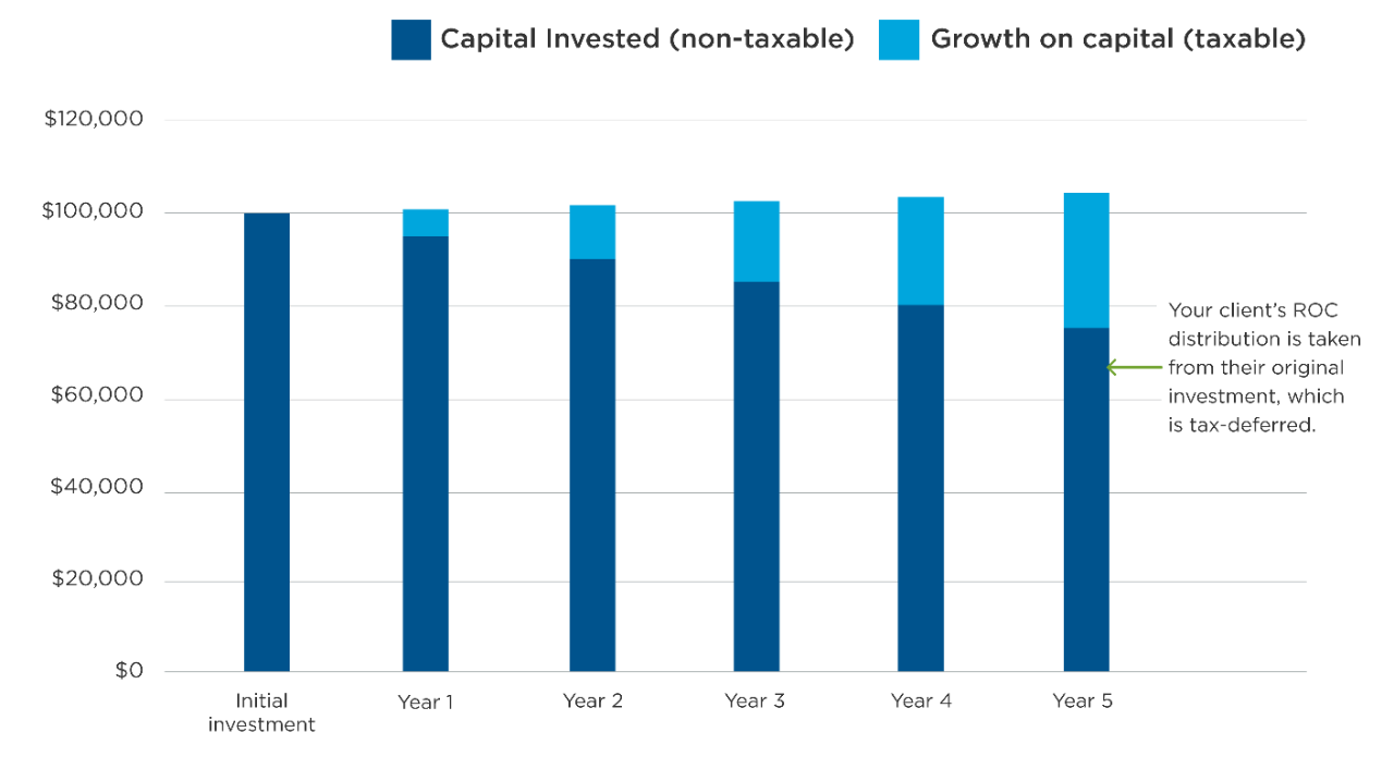 A Series T investment allows your clients to defer the taxes on return of capital distributions they receive, and pay those taxes at a more advantageous time in the future. When your client decides to sell the investment, they will realize a larger capital gain than if they had not received return of capital distributions. However, capital gains are taxed at a lower rate than other income and your client can choose to sell when they may fall into a lower tax bracket, potentially reducing their overall tax bill.