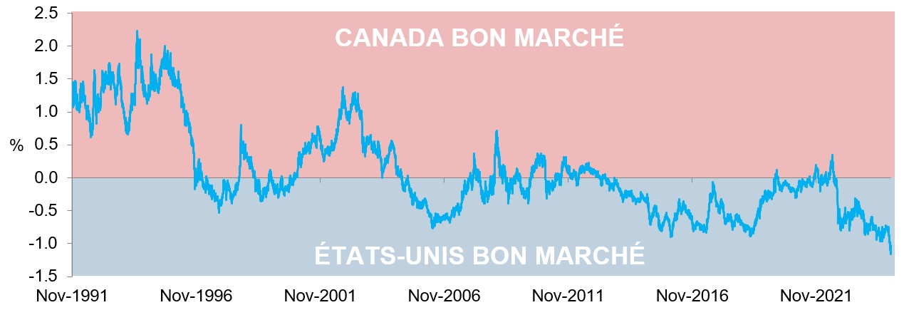 | Écart entre les taux d’émissions d’État canadiennes et américaines à 10 ans | -0,77 % | -0,82 % | -1,07 % | -0,25 % | -0,19 % | -0,30 % |