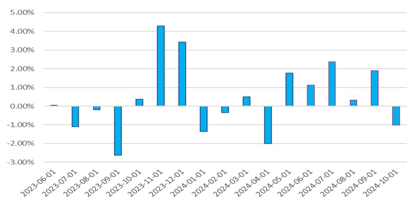Pour le mois d’octobre, en cumul annuel et sur un an, les obligations fédérales canadiennes ont généré des rendements respectifs de -1,3 %, +2,3 % et +9,1 % (Tableau 1), contre -1,0 %, +3,2 % et +11,3 %, respectivement pour l’indice des obligations universelles. Les obligations de sociétés ont fait meilleure figure que les obligations d’État, inscrivant un rendement de -0,5 % sur un mois. De plus, les rendements de +5,4 % en cumul annuel et de +12,9 % sur les 12 derniers mois placent les obligations de sociétés canadiennes de qualité largement devant les titres d’État. Les obligations provinciales ont cédé 1,3 % au cours du mois et affichent désormais des rendements de +2,2 % en cumul annuel et de +12,6 % sur un an.